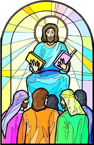 Jesus with a halo behind his head, seated, delivering the Sermon on the Mount. Clear static-cling vinyl decal effortlessly attaches to glass without the need for any adhesive. Advanced UV protection insures material will not discolor or damage glass. Vinyl decal material and ink are safe for outdoor or indoor use. Simple to remove, the vinyl decals can be easily reapplied without loss of static cling. Many standard sizes are available, no additional charge for custom sizes.